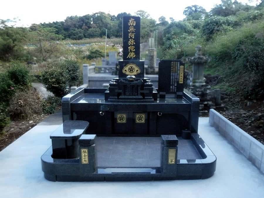 和型から洋型のお墓に建て替えられました。炎型の香炉が特徴的で黒い石を使用しているので、金箔の文字が映えます。入口左側に収納型ベンチを設置しました。