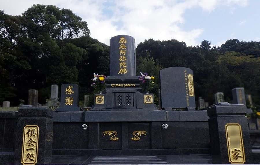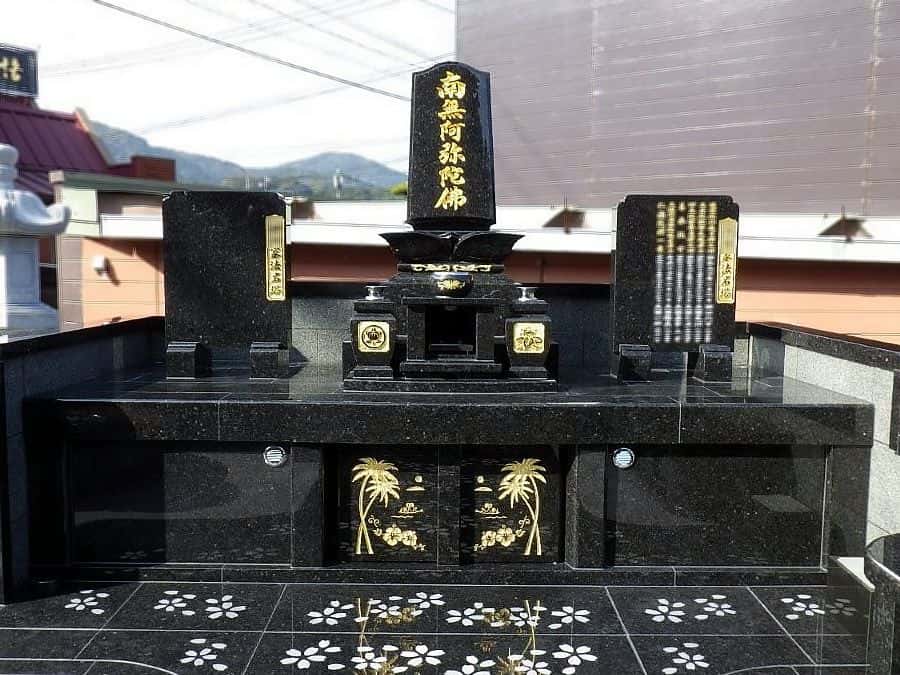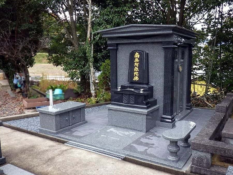 新しく和洋型のお墓を建てられました。黒系の石なので、金箔がとても映えています。墓石後方のブロック塀の一部を切り取り、後ろからも出入りできるようになりました。