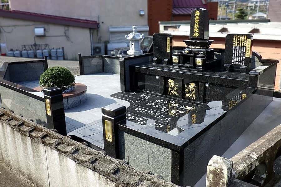 墓場所を変えて2件分をまとめて新しく和洋型のお墓を建てられました。黒色の石なので金箔がとても映えています。敷地左側には前墓所にあった春日灯籠と新しく花壇を設置しました。以前の墓所は石塔一式他撤去処分しました。