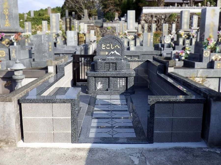 広さがある場所に建てられた洋型のお墓。竿石と法名塔は緩やかな曲線が特徴です。外柵は化粧ブロックで縁に黒系の石を使用し仕上げました。