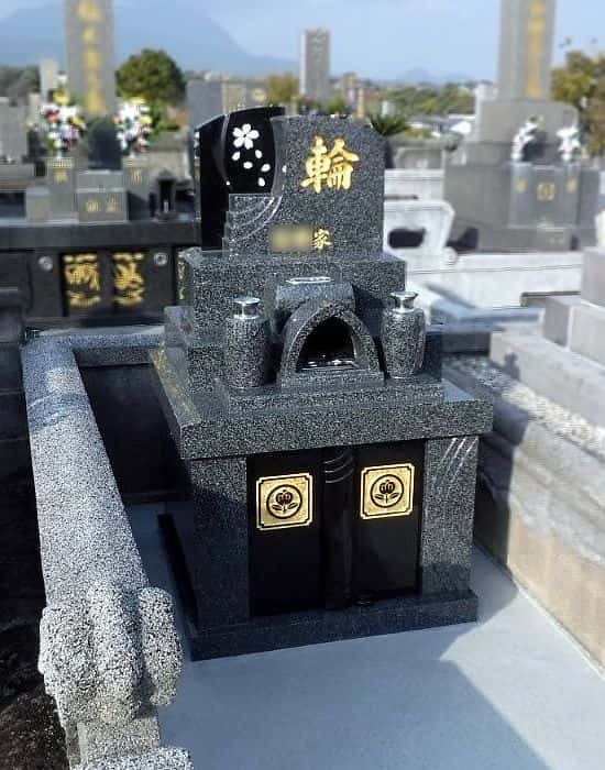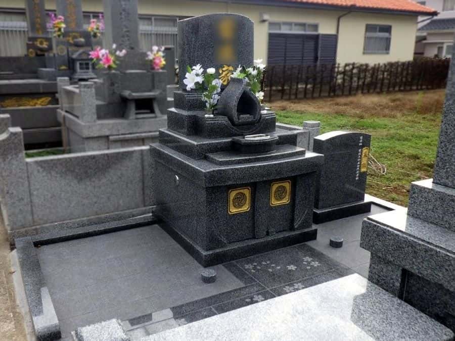 更地だった場所に、展示品「まど花」のデザインで建てられました。周囲は低めの外柵で右側に法名塔を設置し、土間は貼り石なので掃除もしやすいです。